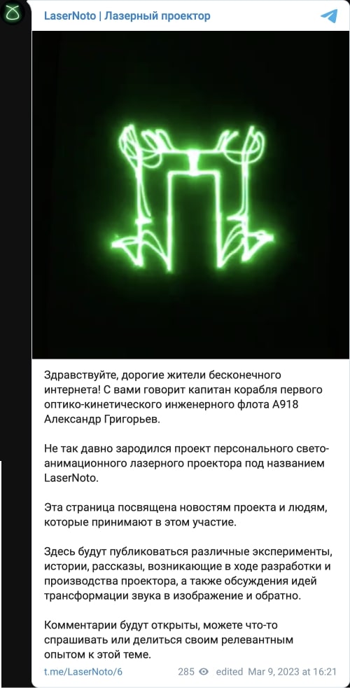С ценовой политикой можно ознакомиться в официальном Telegram-канале автора. Там же, в комментариях — задавать вопросы. На самом деле, примеров работы LaserNoto там уже достаточно, так что можно сформировать цельное представление о новом устройстве. Я лишь могу пожелать Александру удачи: пусть всё задуманное доведётся до ума, а коллеги-музыканты заинтересуются новой разработкой. Кстати, могу предположить, что главной целевой аудиторией среди музыкантов по итогу станут неформальные музыкальные объединения, владельцы клубов, организаторы фестивалей. Посмотрим, как будет на самом деле.